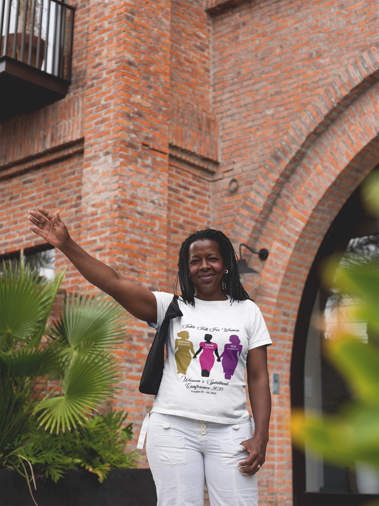 Across the chest, three elegant silhouettes walk forward in unity, rendered in warm gold, bold magenta, and deep plum. Each figure represents the heart of the conference: strength in community, growth in faith, and willingness to step boldly into service. The design is meaningful yet minimal, offering a quiet beauty that resonates long after the conference ends.